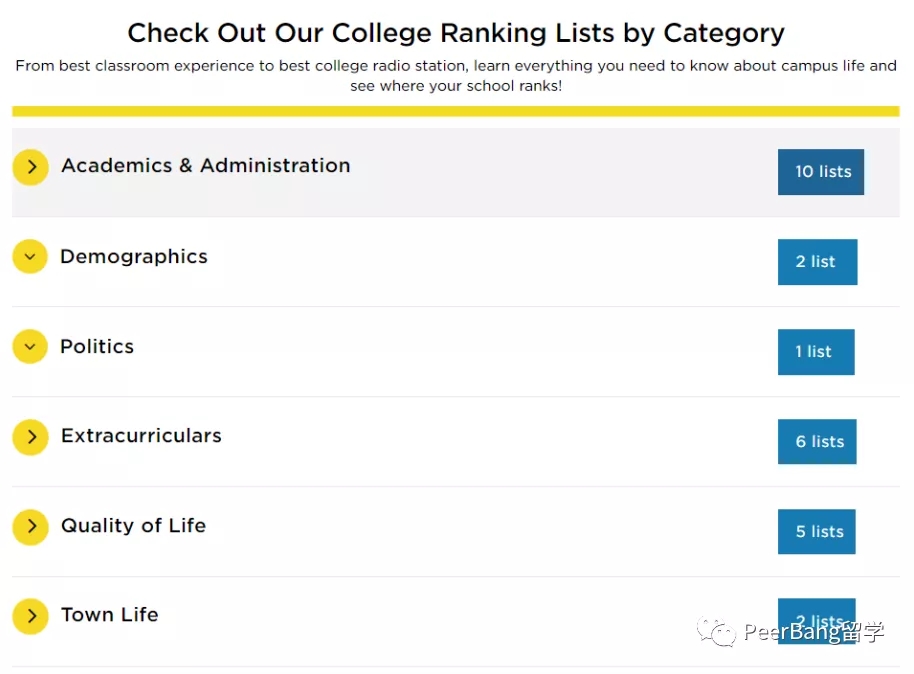 总之,你可以很容易根据自己的侧重点找到最适合自己的学校。下面的列表默认按人气顺序排序。《普林斯顿评论》的主题名单没有排名。美国院校排名