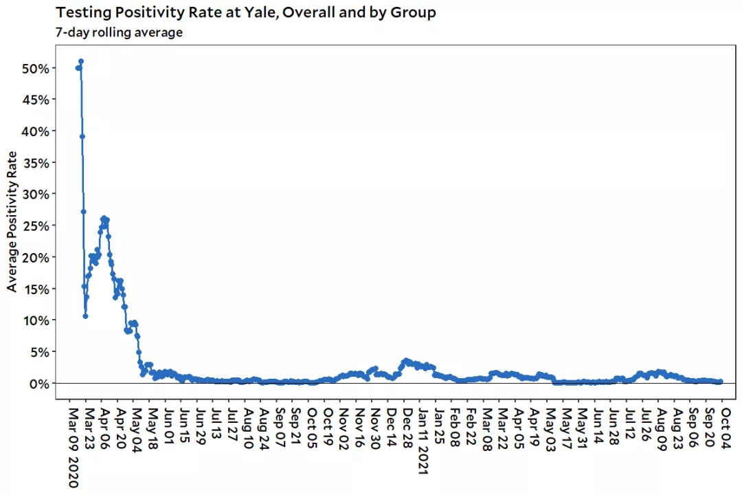 新冠疫情还会持续多久?至少在美国最好的大学,新冠问题已经基本被解决了。根据最新的公开数据,耶鲁大学目前在常春藤联盟中拥有第二多接种疫苗的本科生,99.5%的本科生完全接种了的COVID-19疫苗。因此,耶鲁的阳性率非常低。在过去的7天里,耶鲁在对5624名本科生进行检测之后,没有一个结果呈阳性,原来留给新冠感染者的隔离住房也完全空置了。