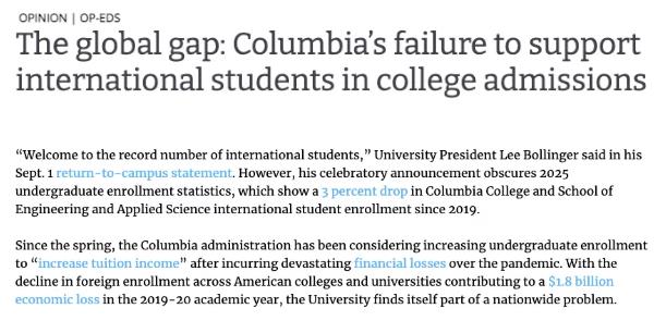 哥伦比亚大学校报同时也批评了学校这几年录取中对国际学生的不友好。2021年,本科生新生国际学生占比为13%,比2019年的16%下降16%。校报评论应该通过增加对国际学生奖学金等手段,吸引全球最优秀的学生。