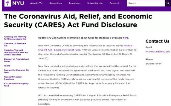 纽约大学已经提交了《CARES法案》资金的申请并收到了资金批准,纽约大学将根据《CARES法案》的要求将所收到资金的不少于50%的部分用于向学生提供紧急财政援助赠款。纽约大学会按照联邦学生援助紧急救济基金(Federal Student Aid-Emergency Relief Fund)的要求提供资金发放信息,并将在每个日历季度(9月30日,12月31日,3月31日,6月30日)结束后不晚于10天内更新相关信息。美国留学福利