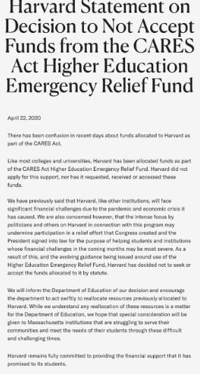 2020年4月耶鲁大学拒绝了第一轮680万美元的捐助款项,因为当时新冠疫情的扩散速度以及对学生和高等教育机构的影响仍存在着高度的不确定性,彼时耶鲁大学能够从大学资金中为其学生提供紧急支持。现在校方对大流行病的进程有了更清晰的认识,并且认为通过这种途径向学校经济上最有需要的学生提供额外的援助是合适的,因此可以申请紧急援助资金。