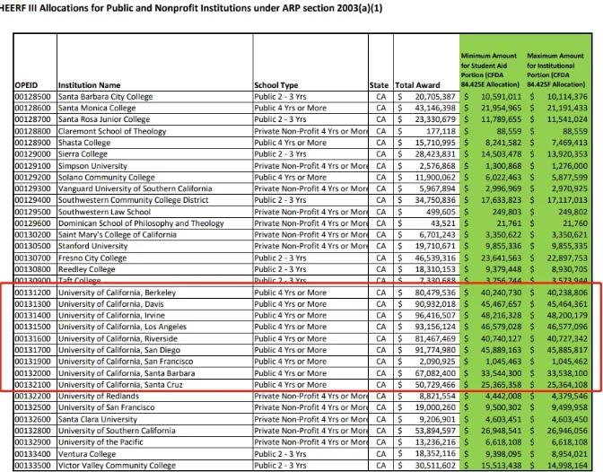 例如纽约哥伦比亚大学(Columbia University)提供了500至2000美元的救济金;位于华盛顿特区的美国大学提供了最高1500美元的资助;加州州立大学萨克拉门托分校的救济金从100美元到850美元不等。