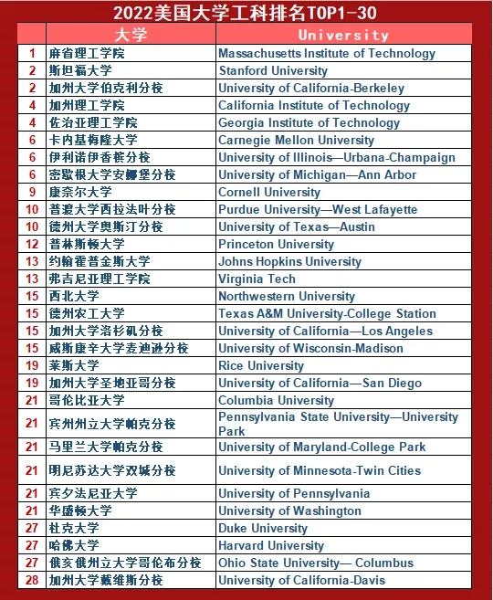 2022 U.S.News美国本科工科排名一览