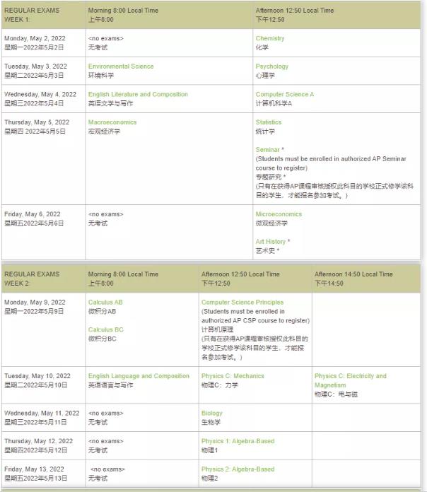 2022年Ap考试将在5月2日-6日和5月9日-13日两周内以线下考试形式进行。2022年Ap考试不提供网上考试选择。美国本科