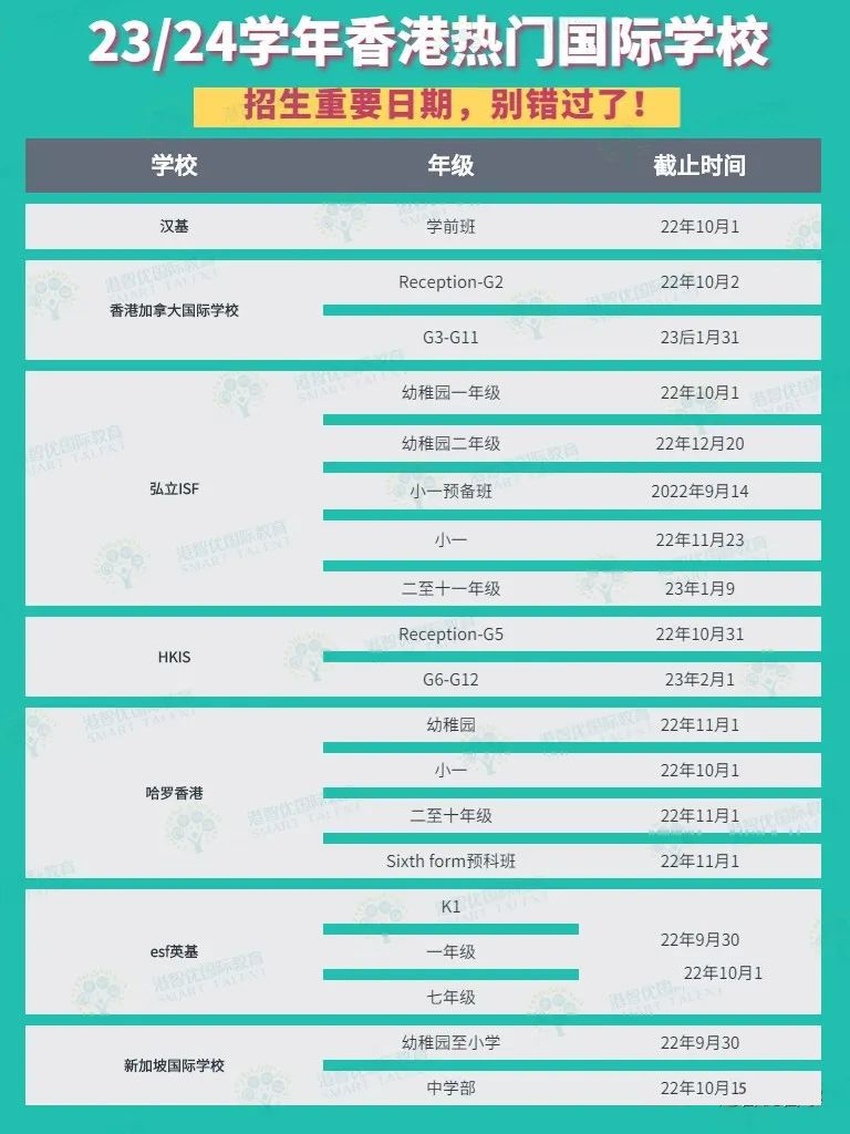香港不少国际学校在8、9月开放了申请,如香港汉基,香港加拿大国际学校,香港弘立书院,香港国际学校HKIS,英基ESF,新加坡国际学校,个别年级申请周期很短,会在9月底或者10月初截止23年入学申请,下面一起看看香港的这些热门国际学校各年级具体申请截止时间!