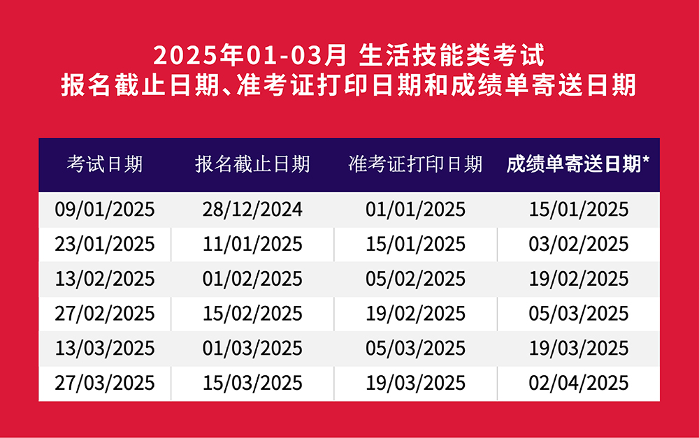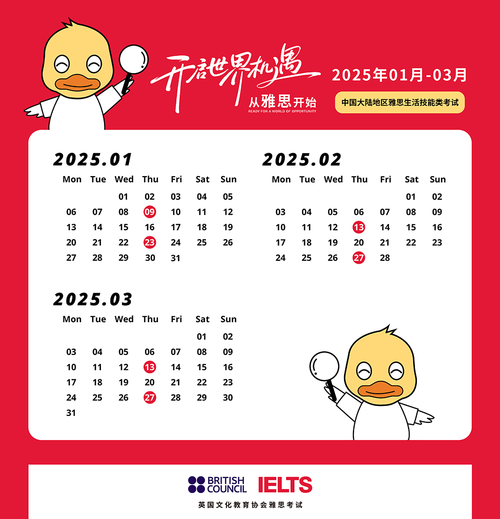 2025年1-3月雅思考试(IELTS)、用于英国签证及移民的雅思考试(IELTS for UKVI)和用于英国签证及移民的雅思生活技能类考试(IELTS for UKVI Life Skills)全部场次将于11月25日14时开放报名。