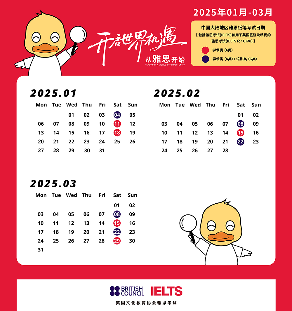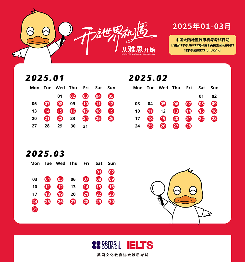 下面是2025年1-3月最新雅思考试日历,考鸭们赶紧挑选心仪日期报名,别错过驶向梦想的第一列春季特快!