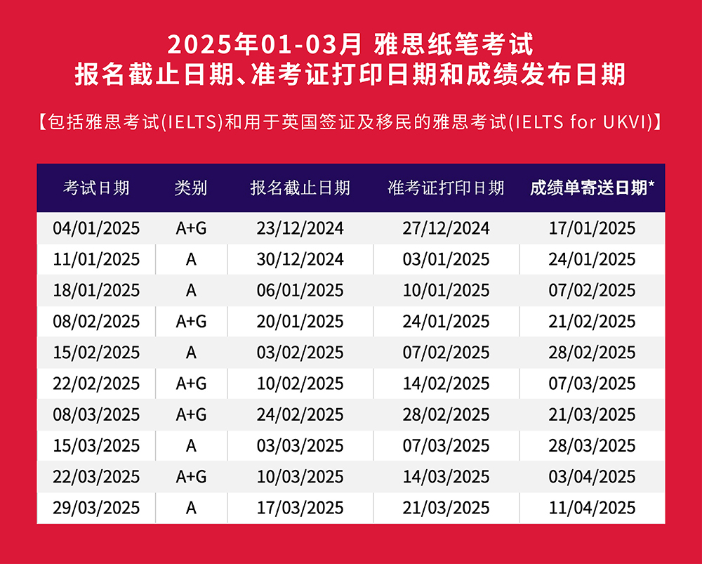 2025年1-3月中国大陆地区雅思纸笔考试报名截止日期、准考证打印日期和成绩单寄送日期