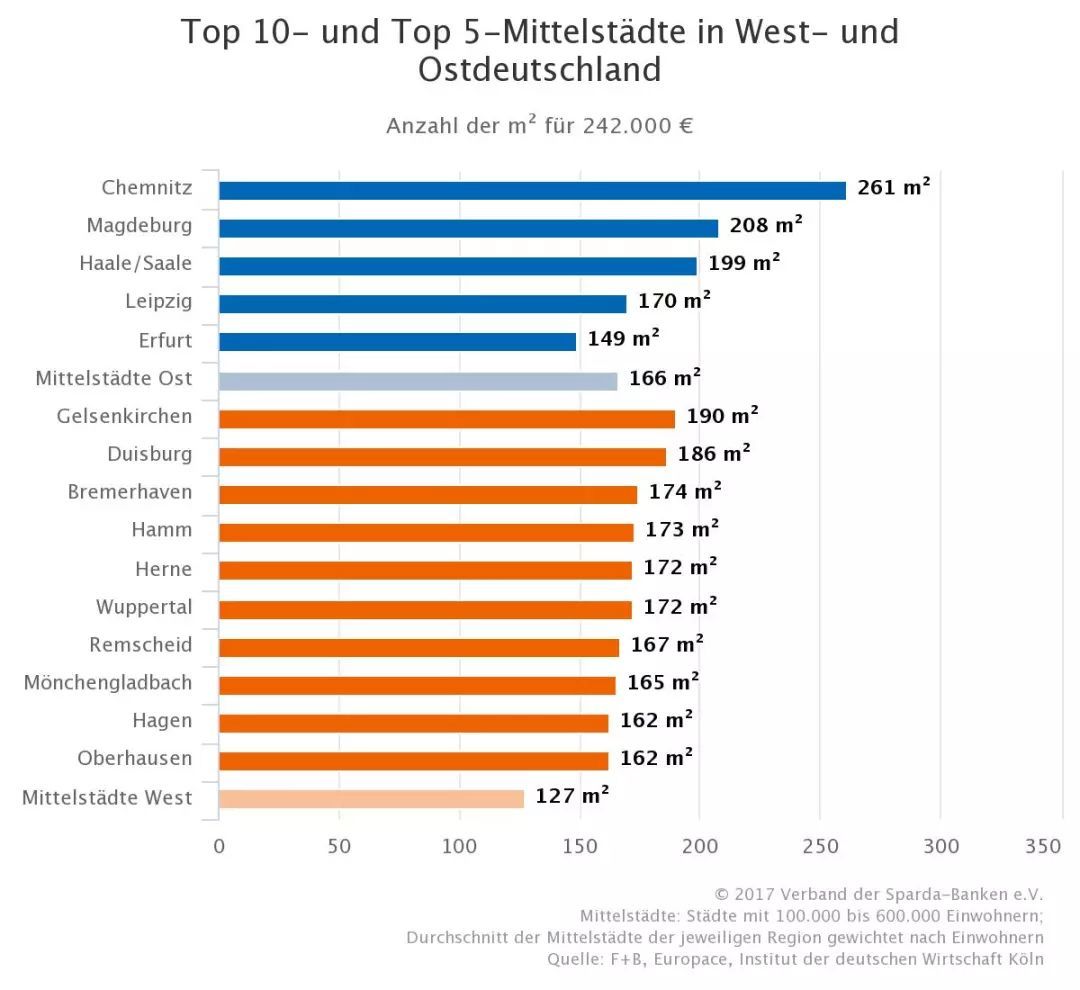 德国拥有最便宜房价的城市在哪里?答案是——东德城市开姆尼茨!以当地居民19603欧元的平均年收入,在开姆尼茨只需要将近4年的年收入,就能买到100平米的房!24.2万欧元,在开姆尼茨可以买261平米的房子啦!