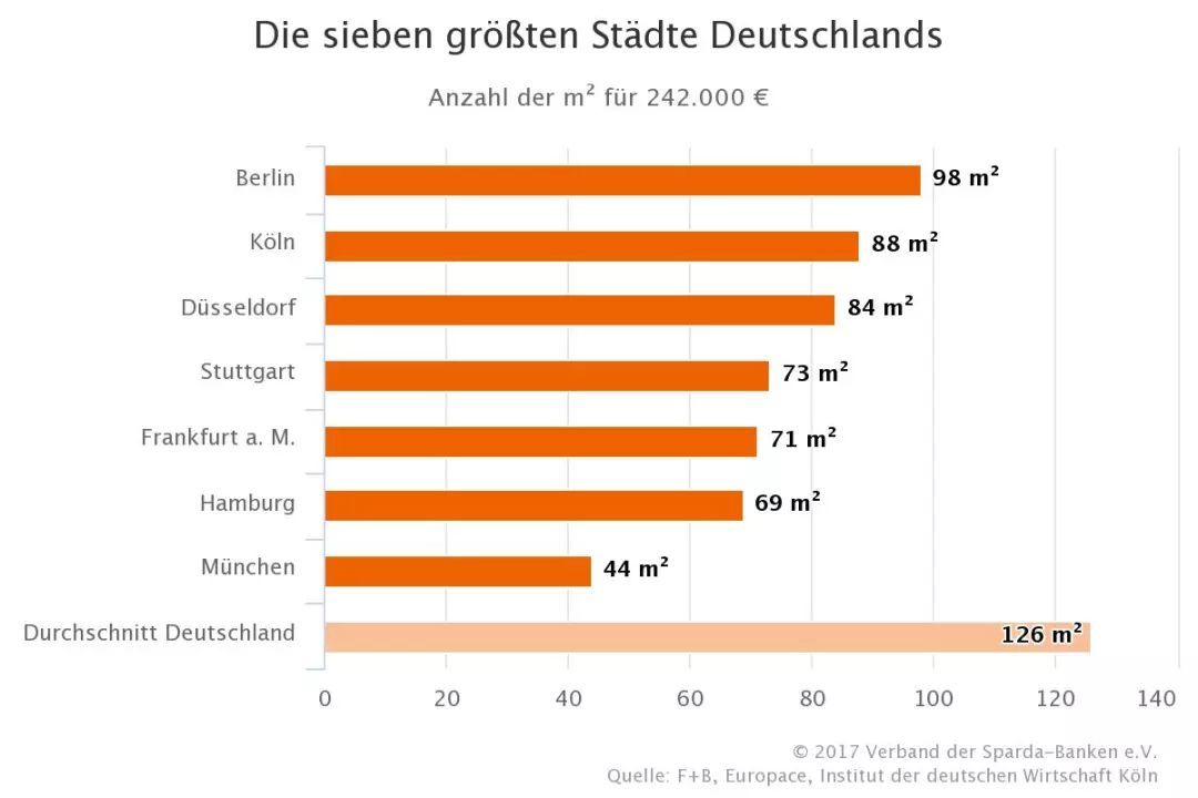 24.2万欧元——这个所谓的德国标价在慕尼黑买房只能买到44平米,汉堡69平米,法兰克福71平米,斯图加特73平米,杜塞尔多夫84平米,科隆88平米,柏林98平米。