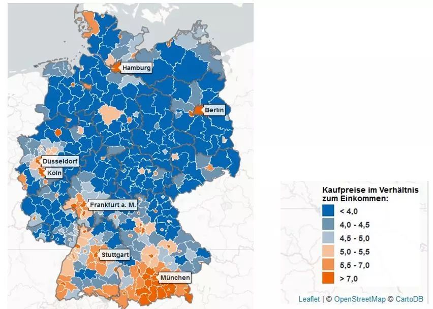 但德国各地房价不同,并不是每个城市都符合这样的平均标准。研究机构将德国划分为402个地区,蓝色的地区,和当地收入相比,越是容易买房;越接近橙红色,买房需要的净收入年数越高。