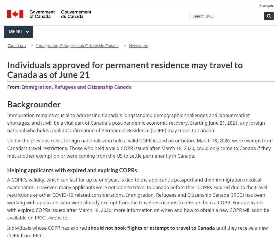 加拿大政府正式宣布:自6月21日起,持有效的COPR(永久居民确认信,也叫“PR登陆纸”)的申请人可以完成在加拿大的登陆。