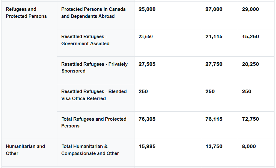 在 2023 年和 2024 年,难民类别的总体目标将分别超过 76,000 人,然后在 2025 年降至 72,750 人。