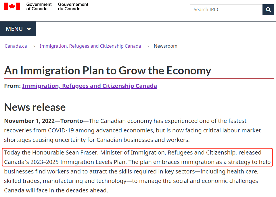 加拿大时间2022年11月1日,加拿大移民局公布了2023-2025年的移民水平计划!