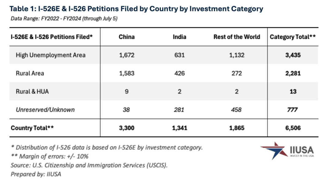 上表显示,2022财年至2024年7月5日共提交了6,506 份I-526E和1-526请求,代表约52亿美元EB-5资本投资。