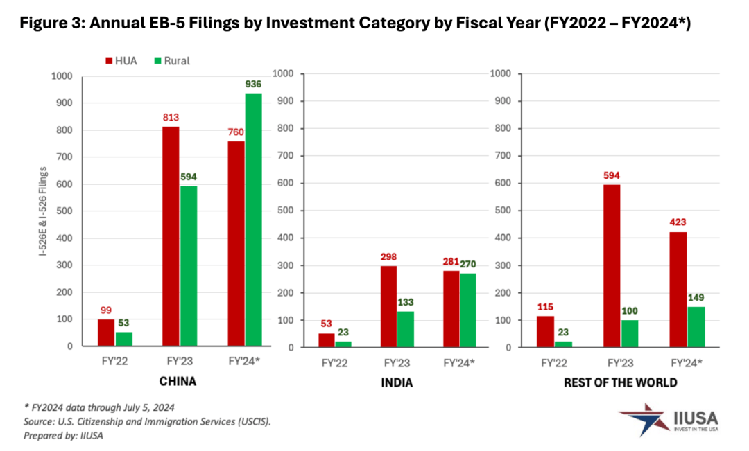 自EB-5改革和诚信法案(RIA)通过以来,全球对EB-5项目的需求显著增加,特别是在2023财年和2024 财年。
