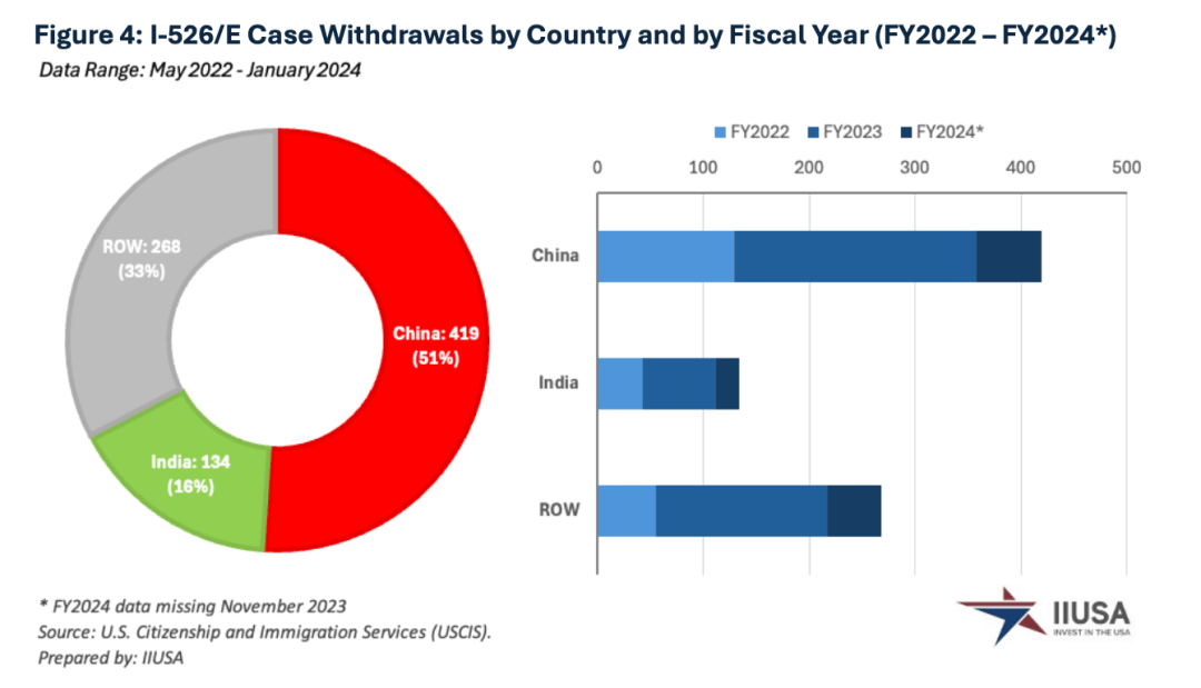 2022年5月至2024年1月期间,至少有821份l-526申请被撤回。中国投资者占撤回申请的大多数(51%),这可能是因为处理延迟、签证倒退以及可以选择新政重新申请。
