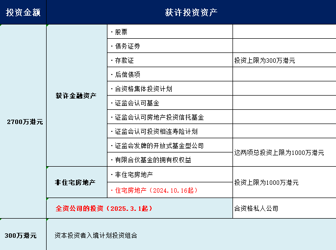 2024年10月16日起,容许投资住宅物业,该物业成交价须为港元5000万元或以上,投资于房地产获计算入投资总额上限为港元1000万元;